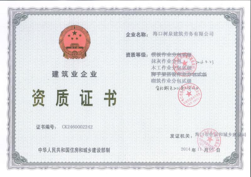海口樹泉建筑勞務有限公司成立于2011年,公司位于海口,其前身是一家專業(yè)建筑施工隊,自2004年即開始在海南從事建筑勞務施工。自成立至今,公司已經(jīng)擁有一支科學管理、質(zhì)量過硬、能打硬仗,搶工期的專業(yè)隊伍。能獨立承擔大中型工業(yè)與民用建筑 、室內(nèi)外裝修、各類機電設備安裝工程。代表工程有海口濱海華庭、三亞時代海岸T01/02/04/05棟高層、合肥東海花園二期、陵水富力灣B區(qū)高層、三亞金中海(酒店)、瓊海大印經(jīng)典花園、海口環(huán)球海景大酒店(四星級酒店,在建中)、陵水珍珠大廈(五星酒店)、海口萬達廣場、美蘭機場二期。